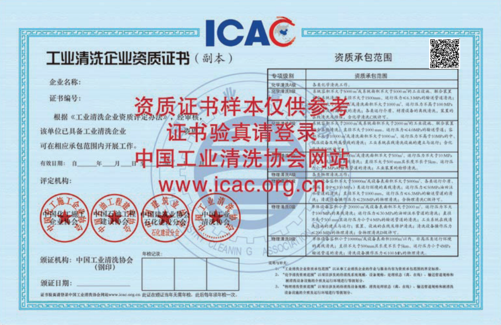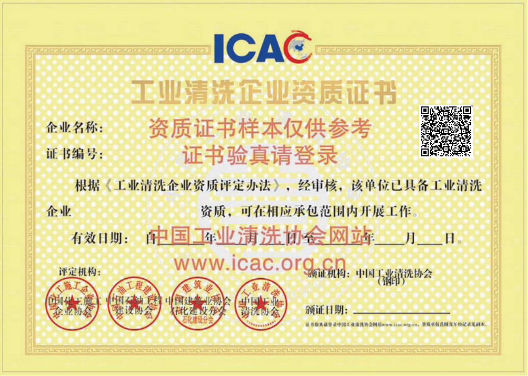 ? ?工業(yè)清洗行業(yè)規(guī)范市場 秩序、強(qiáng)化行業(yè)自律、實施工業(yè)清洗資質(zhì)管理工作在中國化工施工企業(yè)協(xié)會、中國石油工程建設(shè)協(xié)會、中國建筑業(yè)協(xié)會石油化工建設(shè)分會監(jiān)督指導(dǎo)下,由中國工業(yè)清洗協(xié)會組織實施。請各單位在試行中注意總結(jié)和發(fā)現(xiàn)問題,及時反饋到中國工業(yè)清洗協(xié)會,以便今后進(jìn)一步修改完善。